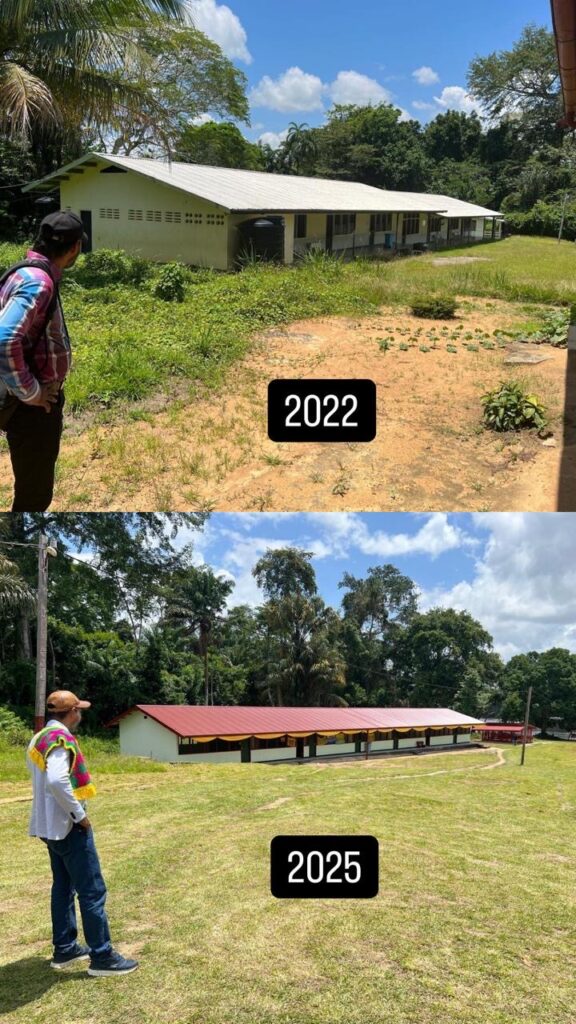 En esta aldea, 132 estudiantes y 11 maestros ahora tienen acceso a nuevas aulas y viviendas para docentes. Antes del proyecto, muchas familias enfrentaban decisiones difíciles. Algunos padres debían pagar un promedio de 130 SRD por niño al año solo para el transporte a la escuela más cercana, un gasto significativo considerando que los ingresos familiares varían cada mes dependiendo de los recursos disponibles. Antes de las renovaciones, la escuela carecía de electricidad, agua corriente y saneamiento adecuado. La instalación de un sistema de recolección de agua de lluvia garantiza ahora que estudiantes y maestros tengan acceso a agua y mejores condiciones de higiene.