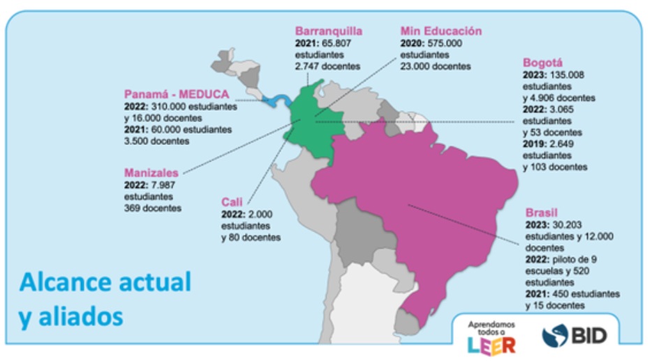 Actualmente se han beneficiado a casi 1.2 millones de estudiantes y 62,000 docentes de escuelas de Colombia, Panamá, Venezuela y Brasil.
