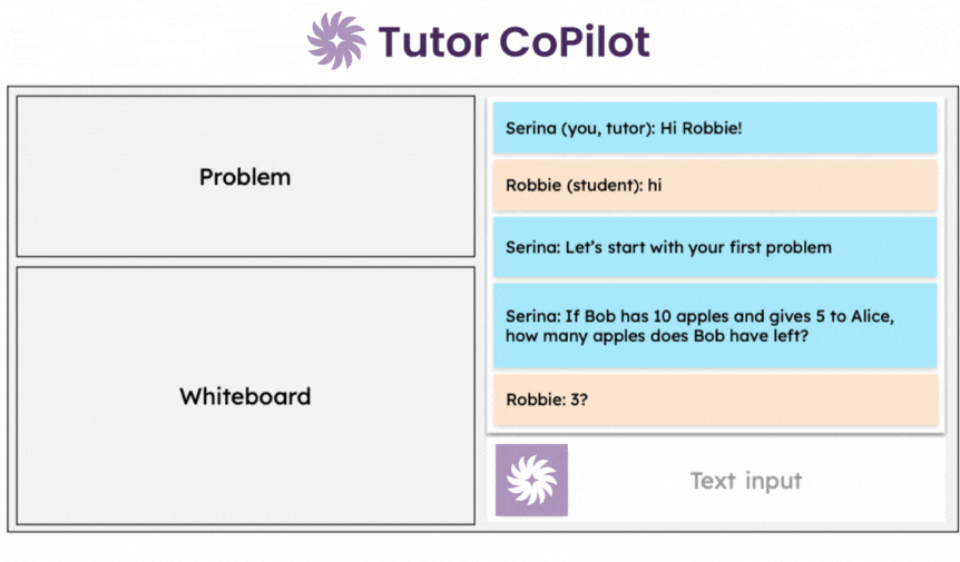 Figura 2: Ilustración de Tutor CoPilot. Tutor CoPilot proporciona sugerencias en tiempo real para los tutores sobre cómo ayudar a los estudiantes que enfrentan desafíos. Estas sugerencias siguen estrategias informadas por expertos, como hacer una pregunta guía o proporcionar una pista.