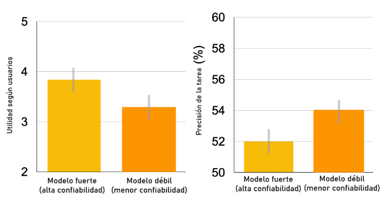 En nuestro trabajo sobre la evaluación de interacciones entre humanos y sistemas de IA —en este caso, modelos de lenguaje— para tareas de búsqueda de información como responder preguntas, también observamos una desconexión entre la percepción de utilidad de los usuarios y el rendimiento real de los modelos en el desempeño de la tarea específica: los modelos de lenguaje que los usuarios reportaron como útiles no siempre fueron los más precisos (Ver la figura 2).