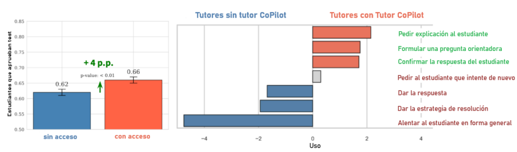 Figura 4: Resultados de Tutor CoPilot. (Izquierda) Encontramos que los estudiantes que trabajaron con tutores que tenían acceso a Tutor CoPilot tenían un 4% más de probabilidades de aprobar sus pruebas de lecciones de matemáticas. (Derecha) Los tutores con acceso a Tutor CoPilot usaron estrategias que fomentan mejor el esfuerzo productivo, mientras que los tutores que no tenían acceso daban las respuestas correctas y apoyo genérico a los estudiantes.