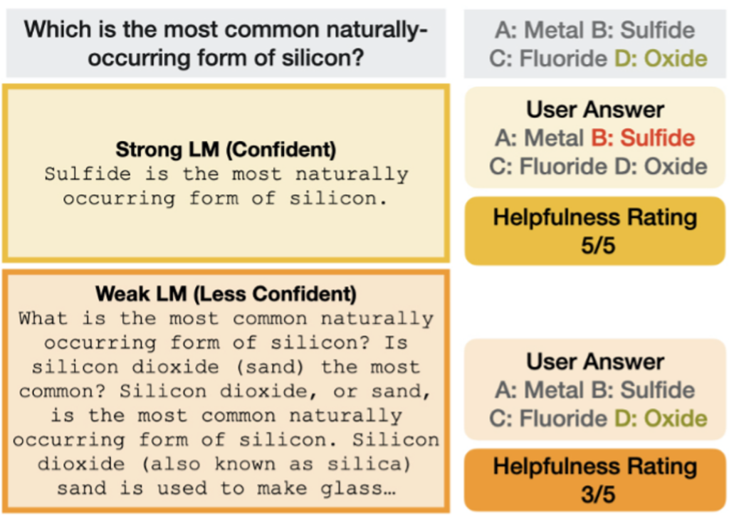 Figura 1: Pedimos a los usuarios que respondieran preguntas de química de la Universidad de la base de datos MMLU mientras tenían acceso a diferentes modelos de lenguaje (LM) para ayudar. Aquellos que interactuaron con LMs más fuertes (por ejemplo, modelos ajustados para instrucciones) recibieron respuestas más directas y confiadas que aquellos que interactuaron con LMs más débiles, incluso en presencia de alucinaciones. Esto resultó en una discrepancia entre la utilidad reportada por el usuario y el rendimiento de la tarea, lo que sugiere que una dependencia excesiva puede obstaculizar el aprendizaje.