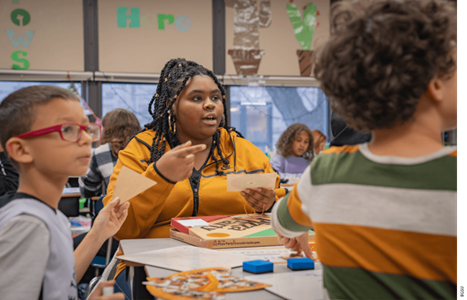 Grace Kirk, estudiante de educación en la Universidad Estatal de Bowling Green, se involucra con un grupo de estudiantes en una sesión de tutoría en la Escuela Primaria Crim como parte de su capacitación docente.