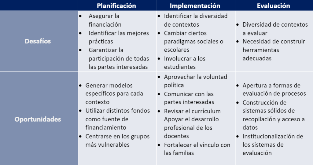 Adicionalmente, se señalaron cuestiones ligadas a la resistencia al cambio y el trabajo fundamental con todos los actores involucrados, así como atender a cuestiones logísticas como transporte, alimentación escolar e infraestructura necesaria para recibir a todos los estudiantes en escuelas con jornada extendida.