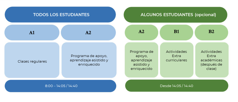 B2: El programa de actividades extraacadémicas ofrece actividades fuera del horario escolar regular, complementando y enriqueciendo los programas A1 y A2.