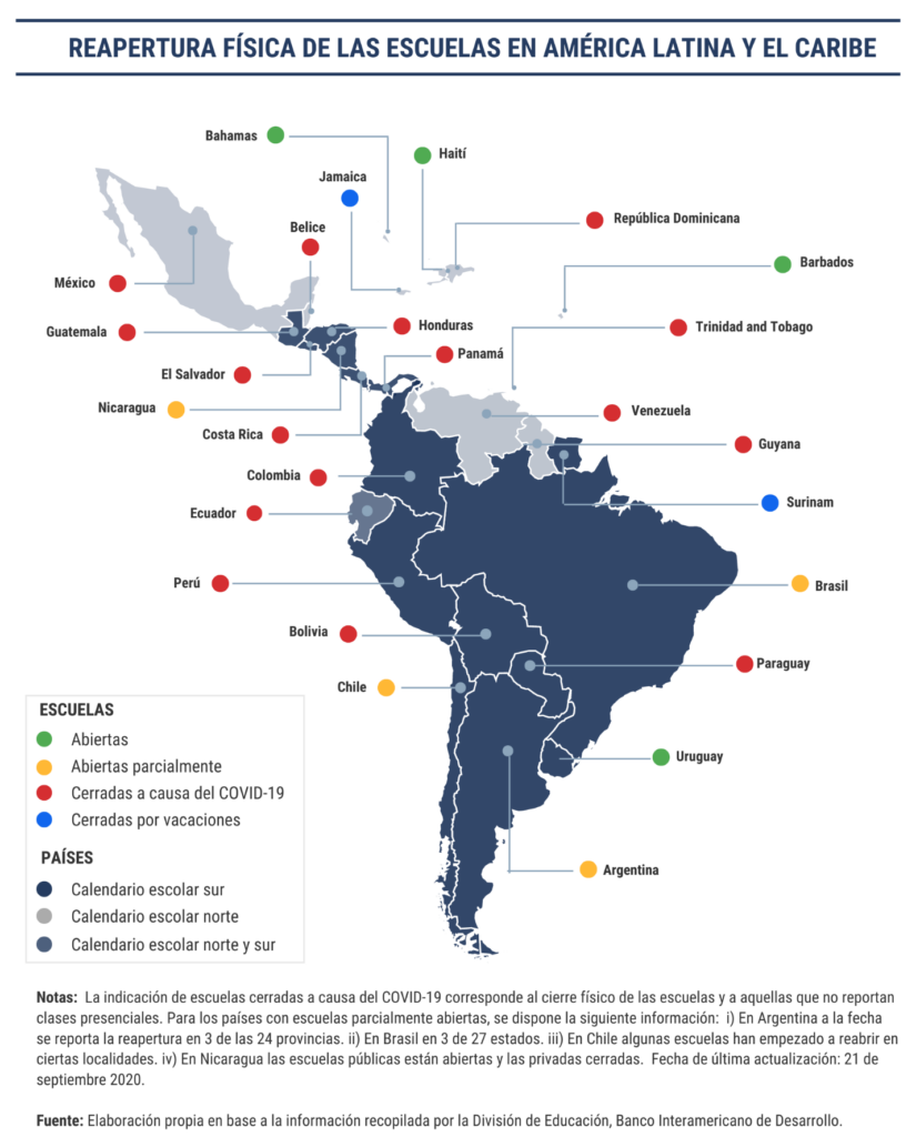 Han transcurrido más de seis meses desde que se confirmó el primer caso de COVID-19 en América Latina y el Caribe. A la fecha, 16 de 26 países de la región mantienen sus escuelas físicamente cerradas y sin reporte de clases presenciales. Mientras que, los sistemas educativos que operan con calendario norte se preparan para el inicio del año lectivo 2020-2021, la reapertura física de las escuelas se ha convertido en uno los temas más recurrentes en las agendas de política educativa.