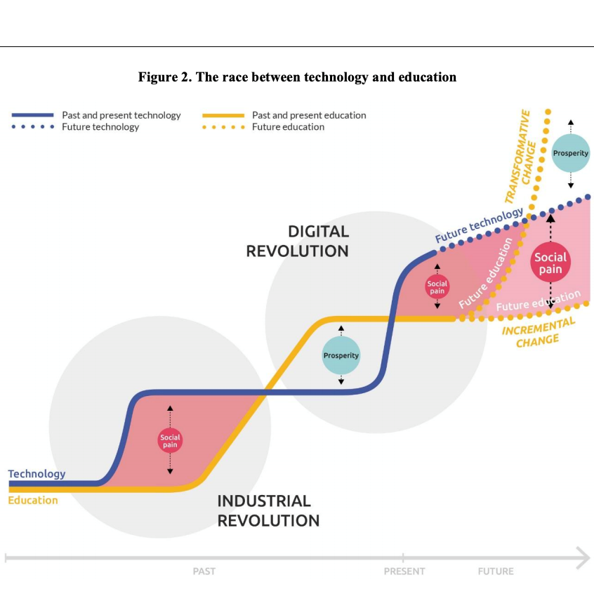En el documento de la OCDE (2016) denominado The Future of Education and Skills 2030 se hace referencia al estudio de Claudia Goldin y Lawrence Katz (2008), quienes tras varias décadas de investigación sobre el sistema educativo de los Estados Unidos establecen su relación con la fuerza laboral y el crecimiento de la tecnología durante todo este siglo. Inspirado en esta investigación, la OCDE elaboró una gráfica que compara la evolución de la educación con la evolución de la tecnología.