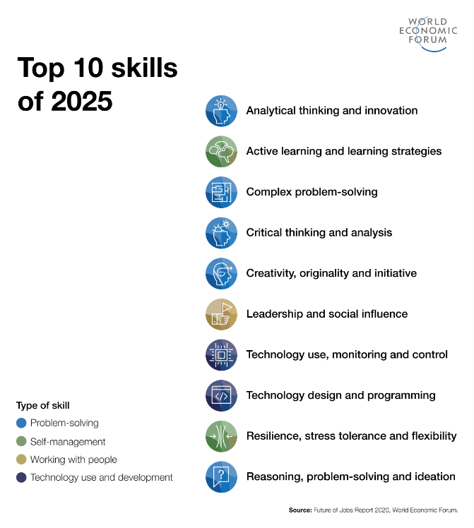 Debemos resaltar que a la educación tradicional con la cual hemos crecido, le cuesta mucho entender esta nueva realidad. Para enfrentar los retos de la cuarta revolución industrial los jóvenes de hoy deben tener un conjunto de habilidades socioemocionales y digitales, como lo muestra el Foro Económico Mundial en su documento Future of Jobs 2020.