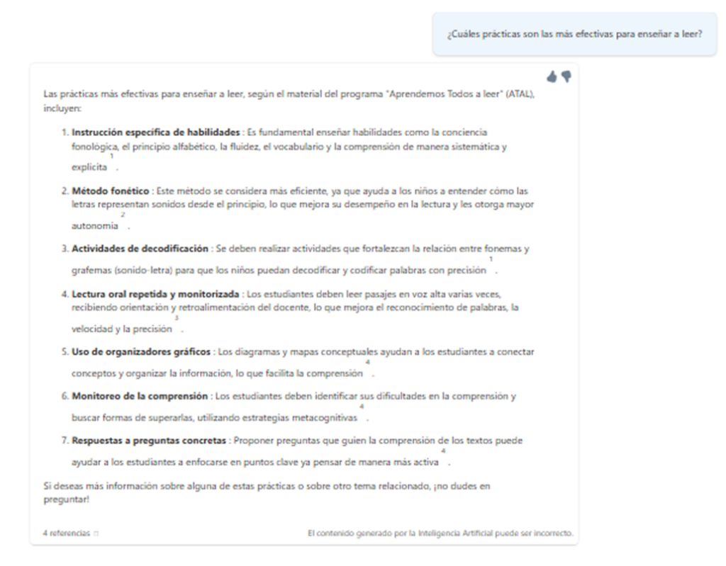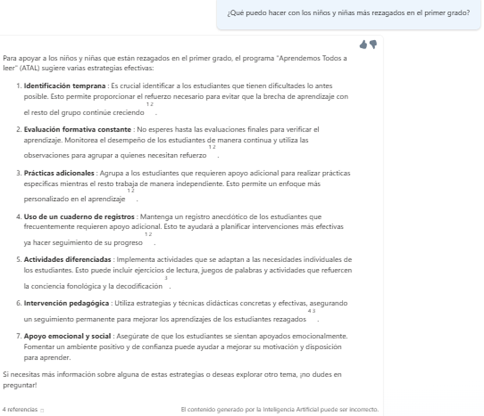 Leo y la Profe Azul son herramientas valiosas para la implementación de ATAL, ya que resuelven dudas, brindan orientación y sugieren actividades que pueden respaldar el programa. Estas herramientas permiten extender las iniciativas educativas, incrementar su intensidad y guiar de manera adecuada los espacios de práctica adicionales que algunos niños y niñas puedan necesitar. Además, al incorporar la inteligencia artificial en las aulas, pueden convertirse en recursos útiles, desafiantes y transformadores. El objetivo es que continuemos trabajando como un equipo para mejorar la calidad de los aprendizajes de los niños y niñas de la región.