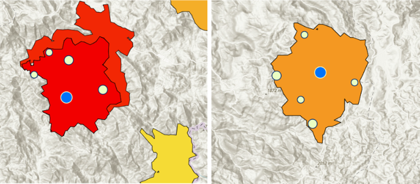 Fuente: Elaboración propia con base a los análisis realizados para el caso de estudio de Honduras. Nota: Las áreas con un rango de colores de verde a rojo indican la dificultad de acceso al terreno, siendo verde un terreno más accesible. Los círculos azules muestran el contraste de utilizar un cálculo de cobertura basado en un radio de 3km vs un análisis que considera el terreno y las posibles barreras.
