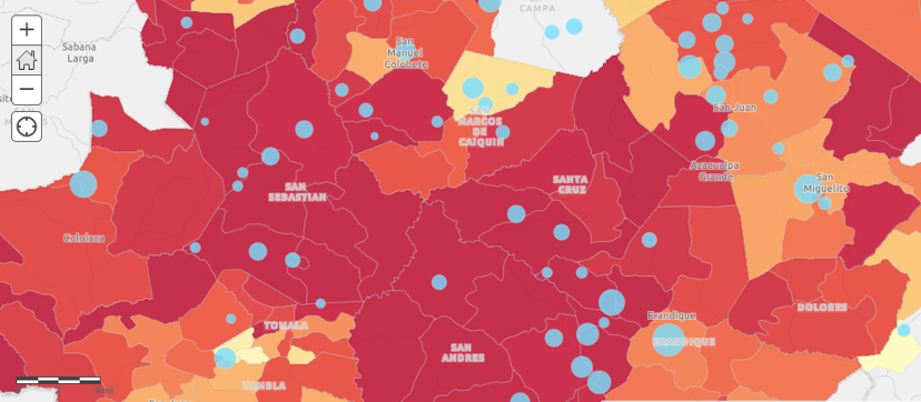 Fuente: Elaboración propia con base a los análisis realizados para el caso de estudio de Honduras.Nota: Los municipios se encuentran clasificados por su porcentaje de pobreza extrema, en rojo los municipios con mayor pobreza y en amarillo con menor pobreza. Los círculos celestes representan las escuelas sin tercer ciclo, su diámetro indicador de la cantidad de estudiantes con matrícula entre 4o y 6o grado.