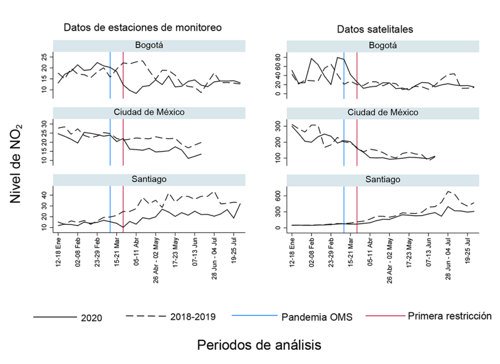 Empezamos analizando las concentraciones de dióxido de nitrógeno (NO2). El NO2 se emite a través de la quema de combustibles utilizados por los vehículos, camiones y buses, las centrales eléctricas y otros equipos. Debido a estas fuentes de NO2, se esperaría que las restricciones de movilidad tuvieran un impacto en las concentraciones de NO2. Comparamos las medidas de NO2 utilizando datos de las redes de estaciones de monitoreo terrestres con medidas provenientes de los datos satelitales recogidos en el Tablero de Impacto del Coronavirus del BID y IDB Invest. Estas dos fuentes de datos tienen diferentes ventajas y se complementan. Las estaciones terrestres de monitoreo proporcionan medidas precisas del volumen de gases/partículas contaminantes en el aire y el nivel de exposición para las personas que se encuentran cerca de estas estaciones, pero las mediciones dependen de contar con una red de estaciones que sea densa geográficamente. Los datos satelitales están disponibles alrededor del mundo y permiten una mejor cobertura geográfica. Sin embargo, las medidas de los satélites no tienen en cuenta diferentes condiciones climáticas que se producen cerca de la superficie, como los vientos, la lluvia o las nubes, las cuales podrían generar estimaciones imprecisas de la calidad del aire en una localización determinada.