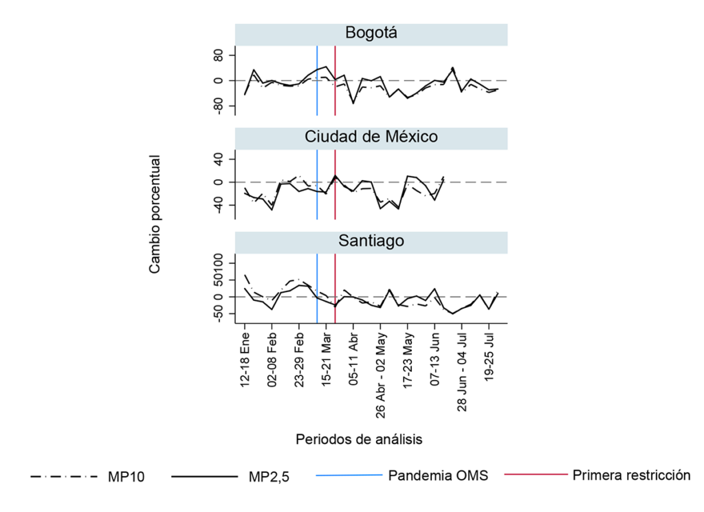Nota: MP: material particulado (los números 2.5 y 10 hacen referencia al diámetro de la materia de las partículas medidas en micrómetros. “Pandemia OMS” indica la fecha en que la Organización Mundial de la Salud declaro declaró la pandemia del coronavirus.