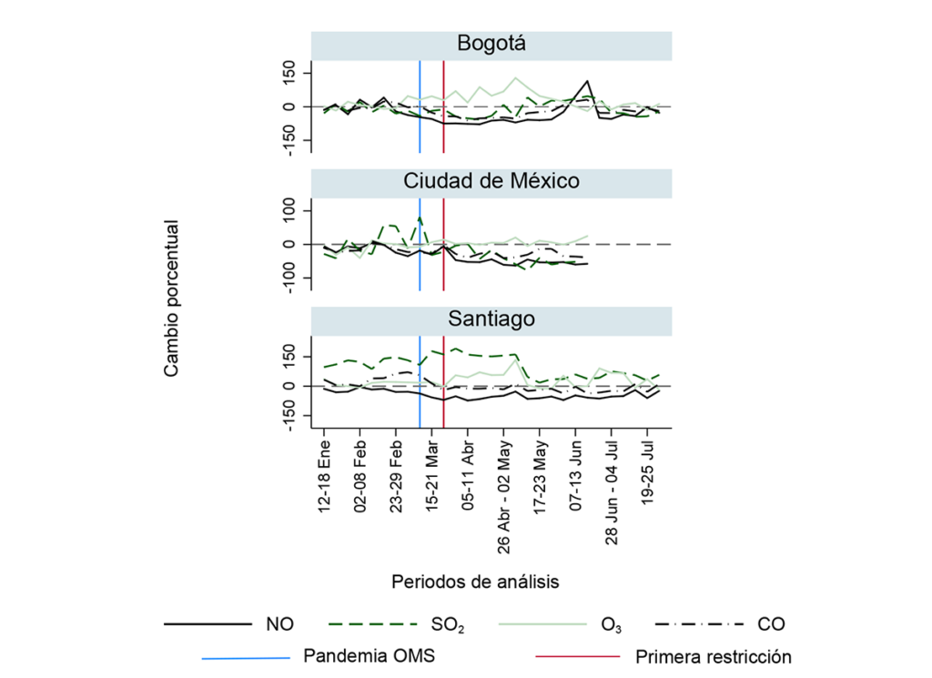 Para analizar cuán prolongado y persistente ha sido el efecto de las restricciones relacionadas con el coronavirus en la calidad del aire en la región, estudiamos varias sustancias contaminantes en tres ciudades de América Latina: Bogotá, Ciudad de México y Santiago de Chile. El análisis sugiere que la importante reducción observada de la movilidad por sí sola no nos llevará demasiado lejos por la senda hacia una mejor calidad del aire a lo largo de todo el año; se requerirían otros cambios sistémicos sustanciales.