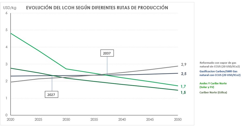 Los análisis demuestran que a partir de 2030 se podrá producir hidrógeno verde en algunas regiones, alcanzando paridad de costes al hidrógeno azul. En la región de la Guajira, en 2027 se alcanzaría la paridad de precios del hidrógeno eólico con el hidrógeno azul (por gasificación del carbón); y en 2037 se alcanzaría el punto de equilibrio del hidrógeno solar.