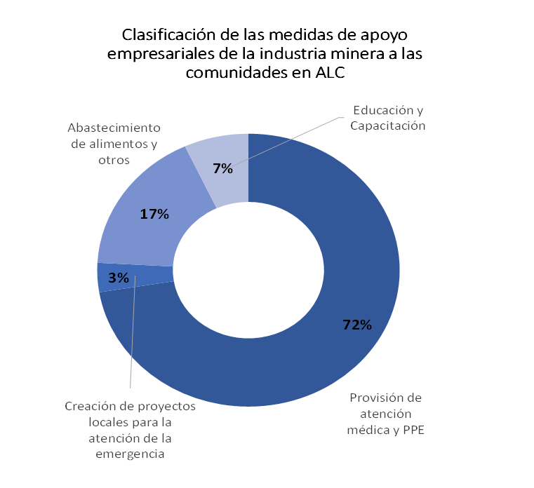 Fuente: Elaboración propia con base en la información publicada por 23 empresas mineras con operaciones en ALC. acciones para apoyar los planes de contención de la pandemia, incluyendo medidas como: i) provisión de equipos médicos o protección individual para distribución en centros de atención prioritarios; ii) extensión de las campañas de limpieza y desinfección a comunidades cercanas; iii) adopción de protocolos para proteger a las comunidades del tránsito de trabajadores; y iv) revaluación de los programas y entregas de ayuda a la comunidad (por ejemplo, canastas alimentarias, obras comunitarias). - Cambio cultural y habilidades para operar en un ambiente de colaboración virtual. El distanciamiento social y el teletrabajo demandan competencias de los trabajadores que no necesariamente se consideraban críticas pre COVID-19. La operación sincronizada de las operaciones requerirá el fortalecimiento de competencias para usar herramientas virtuales por parte de todos los empleados de la empresa.