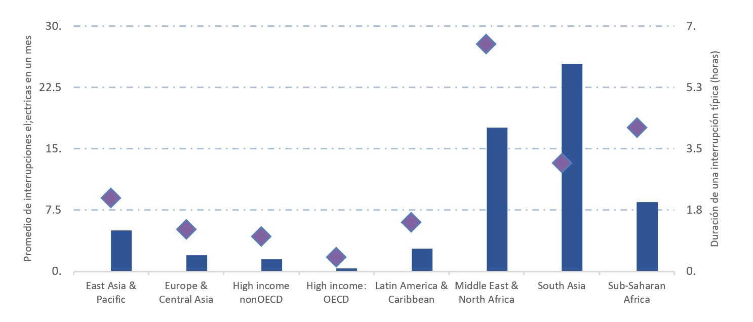 La calidad del servicio en América Latina y el Caribe (ALC) se relaciona con los ingresos de la región. Ver Gráfico 1. Los países de altos ingresos tienen interrupciones muy cortas y de muy baja frecuencia. Los países de ingresos medios: ALC y el sureste asiático tienen mayor duración y ocurren con mayor frecuencia. Mientras que los de bajos ingresos -países del sur de Asia y Sub-Sahara, son los que tienen las interrupciones con duraciones más elevadas y ocurren con mayores frecuencias.Gráfico 1. Duración y número de interrupciones a lo largo del mundo