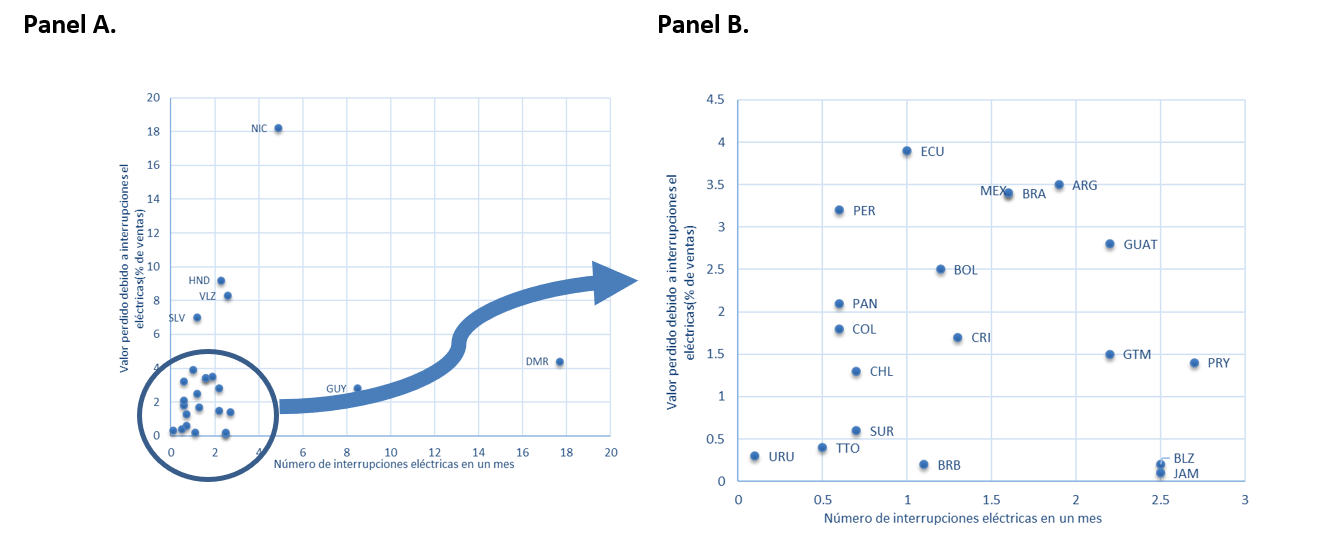 Por el otro lado, los países de LAC tienen grandes diferencias entre ellos. Ver Gráfico 2. Mientras unos países se acercan a estándares de los países de altos ingresos, otros muestran espacio para mejoras.Gráfico 2. Interrupciones y el valor perdido asociado a estas.