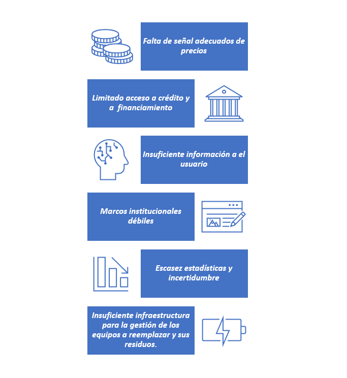 Falta de señal adecuados de precios: En ALC ,con excepción de 6 países -entre estos Chile, Costa Rica y Uruguay- subsidian las tarifas eléctricas principalmente las domésticas. En promedio, los países de la región destinan el 1% de su Producto Interno Bruto (PIB) a cubrir los subsidios eléctricos. Tan sólo en 2017 el monto de los subsidios a la electricidad en ALC ascendieron a USD $37.1 billones. Lo anterior reduce el interés de invertir en EE, ya que alarga los periodos de recuperación de las inversiones en la materia.