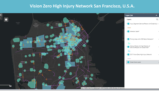 Es acá donde queremos destacar la iniciativa de Vision Zero San Francisco creada en el 2014 con el objetivo de poner fin a todos los accidentes de tráfico graves y fatales para el año 2024. En ese entonces la Ciudad de San Francisco se convirtió en la primera ciudad en Estados Unidos en utilizar datos desglosados por estado de discapacidad, a través del mapeo de los corredores de alto nivel de accidentes de tráfico, y los lugares donde se concentran las lesiones graves de las personas con discapacidades y personas mayores. Estos mapas, así como otras tecnologías como los cubos de flujo en las esquinas de algunas vías, están generando datos relevantes que han ayudado a mejorar las políticas públicas relacionadas a movilidad y accesibilidad.