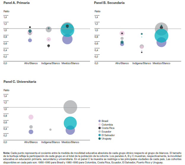 Usando información censal de seis países muestra el cociente entre las medidas de movilidad absoluta (para educación primaria, secundaria y universitaria) ascendente de tres grupos étnicos (afroamericanos, indígenas y mestizos) y las de la población blanca (ver Figura 1). En todos los países analizados, la movilidad ascendente es mayor para blancos y mestizos que para afrodescendientes e indígenas. Los niveles de movilidad absoluta de afrodescendientes e indígenas se sitúan entre un 60% y un 80% por debajo respecto del grupo de blancos. Estas brechas son aún mayores al considerar la movilidad en educación secundaria y universitaria.