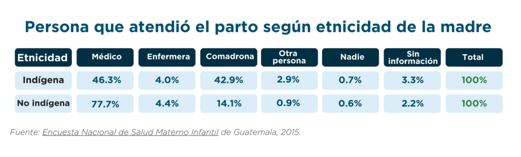 Pese a la preponderancia de la medicina occidental que rige los sistemas de salud pública, los pueblos indígenas mantienen aún ciertas prácticas de salud que resultan efectivas. Es el caso de las prácticas de atención de salud materno infantil. Estos servicios los prestan parteras tradicionales (conocidas como comadronas en Guatemala).
