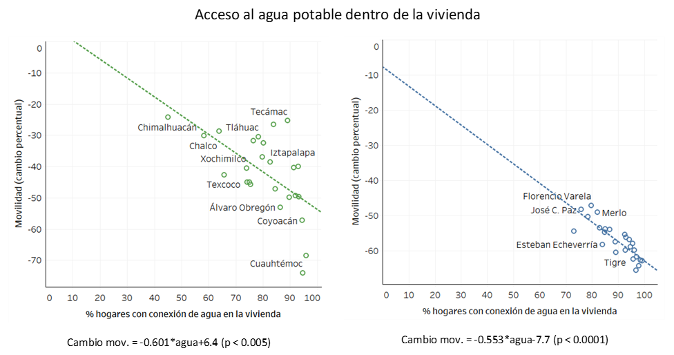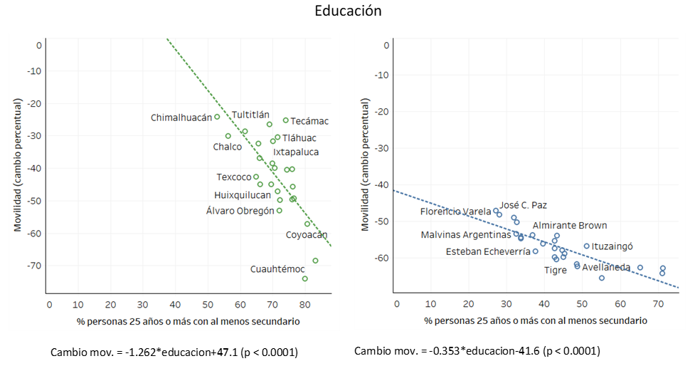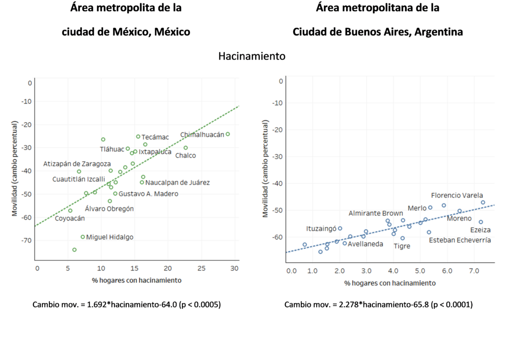 Las gráficas muestran la correlación entre el cambio en la movilidad (eje Y) y proporción de hogares en condición de hacinamiento (eje X). Las medidas de cambio de movilidad para México fueron estimadas por el BID a partir de datos provistos por el proyecto Data for Good de Facebook. La medida de movilidad calcula los cambios porcentuales de movilidad al interior de cada municipio para las fechas entre 16 y 25 de abril, comparando contra la línea de base de enero-febrero de este año. Por su parte, las medidas para Argentina provienen del proyecto “Mapa de Movilidad de las Personas” coordinado por el BID y que utiliza datos provistos por la empresa Veraset. En este caso, la variable muestra los cambios porcentuales en el número de personas que recorren más de un kilómetro por día. Estos cambios se computan para el promedio observado entre el 16 y 25 de abril y el del período del 10 al 12 de marzo. En ambos gráficos se tomaron a los municipios que conforman las áreas metropolitanas de las ciudades capitales. Las variables socioeconómicas provienen de los censos de ambos países (2010), por lo cual son medidas estimadas antes de la crisis.