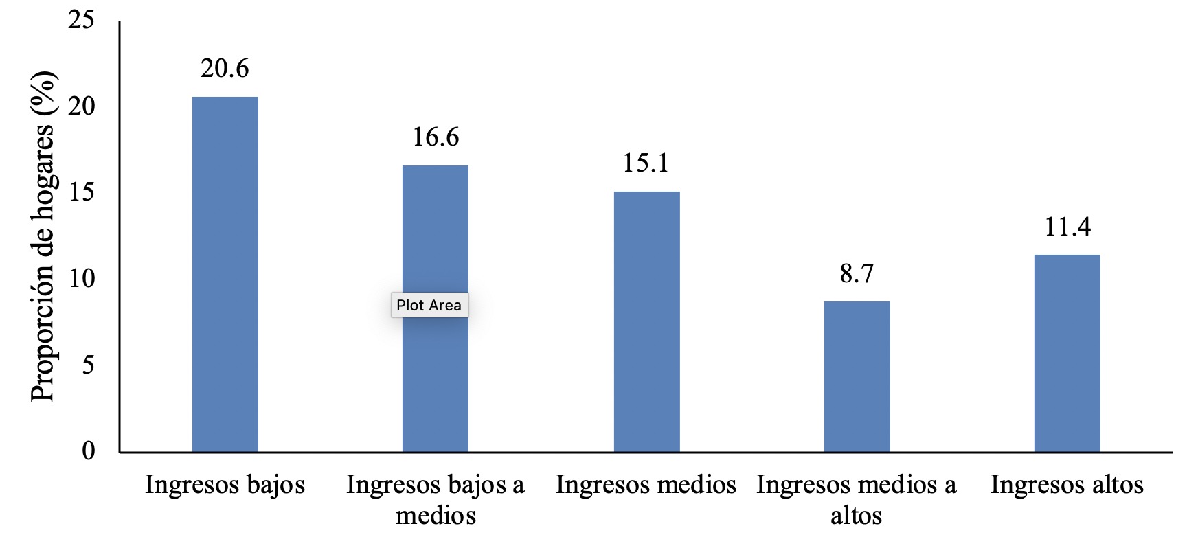 Las mujeres también son más vulnerables al abuso emocional, físico y sexual durante el confinamiento. Por un lado, la pérdida de ingresos puede reducir su poder de negociación en el hogar. Por otro lado, el repentino aumento del nivel de contacto interpersonal en el hogar, el aislamiento forzoso, así como el estrés y la ansiedad añadidos, tanto a raíz de la crisis de salud pública como de la pérdida de ingresos, exacerban los conflictos familiares y la violencia doméstica. Durante el confinamiento, las mujeres tienen menos acceso a sistemas de apoyo y menos vías para reportar y escapar de situaciones en las que son víctimas. Varios gobiernos de la región han registrado grandes aumentos en el número de llamadas a las líneas de ayuda contra el maltrato. Está claro que medir la prevalencia de la violencia doméstica a menudo resulta ser una tarea difícil, propensa a múltiples problemas de datos inexactos. Por ejemplo, el número creciente de llamadas a líneas de ayuda reportando maltrato puede coincidir con una caída en los reportes presenciales. Por otro lado, durante un confinamiento, obtener información precisa resulta aún más difícil debido a la repentina y drástica pérdida de privacidad en el hogar. No obstante, la reciente encuesta BID/Cornell sobre el coronavirus reveló que, en promedio, el 15% de las mujeres experimentaron un aumento en los niveles de violencia doméstica durante la semana anterior, en relación con una situación de normalidad (sin confinamiento). Esto concuerda con los resultados que documentan un aumento de la violencia de pareja en áreas rurales de Uganda y Argentina. Como se muestra en el Gráfico 3, las mujeres de menores ingresos tienen más probabilidades de experimentar peores conflictos y violencia doméstica durante la crisis de la COVID-19.Gráfico 3. Porcentaje de mujeres que declaran un aumento de conflictos y violencia doméstica