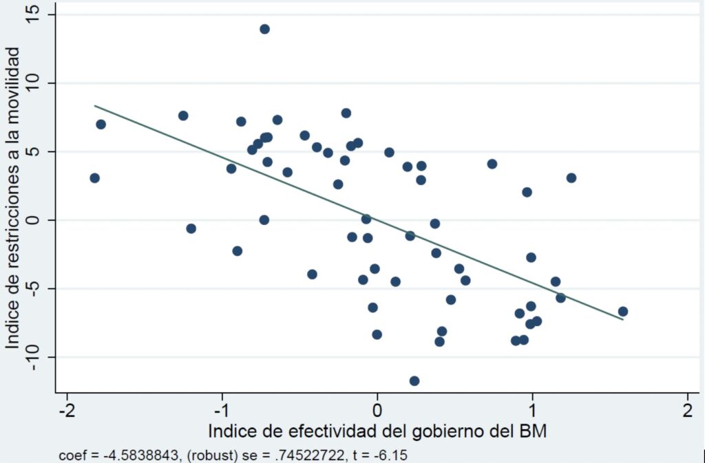 Como es de esperar, el tiempo transcurrido desde el inicio de la pandemia hace que los países hayan implementado medidas más restrictivas aun cuando los casos todavía son bajos. La confianza también importa. En el eje vertical del gráfico 3 se muestran las restricciones a la movilidad y, en el eje horizontal, el Índice de Eficacia del Estado (los datos se controlaron por todas las variables mencionadas anteriormente). Y como puede observarse, aquellos países con gobiernos que presentan mayor capacidad estatal necesitan de menores restricciones a la movilidad para intentar contener el contagio del virus.