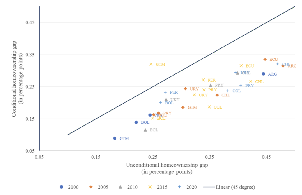 Para mejorar nuestra comprensión de esta brecha en la propiedad de vivienda, examinamos el papel de los factores demográficos en la configuración de esta diferencia. El análisis, representado en el gráfico 1, presenta las brechas de propiedad de vivienda "brutas" y "ajustadas" a lo largo del tiempo. Los datos revelan que los migrantes siguen teniendo muchas menos probabilidades de tener casa propia que los residentes, incluso después de descontar los efectos de los factores demográficos. Por ejemplo, la brecha entre residentes y migrantes en cuanto a la propiedad de vivienda en Ecuador se acercó a 0,45 puntos porcentuales. Aunque los migrantes suelen ser más jóvenes y tener ingresos más bajos que los residentes, encontramos una brecha significativa de 0,32 puntos porcentuales incluso controlando las características demográficas, como los ingresos, la edad y el estado civil.