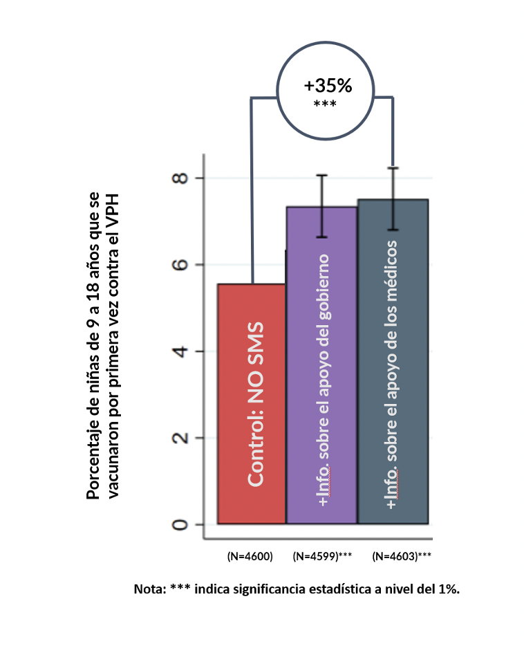 Algunos de los mensajes que tuvieron éxito se diseñaron pensando en padres como Rosa: mensajes que indicaban el apoyo a la vacuna por parte del gobierno y los médicos. Por ejemplo, el grupo de madres que recibió un mensaje indicando la aprobación de los médicos, registró un aumento del 35% en comparación con un grupo de control que no recibió ningún mensaje (ver el gráfico). Los resultados de este y otros mensajes probados en la intervención pueden consultarse en el sitio web del Grupo de Economía del Comportamiento del BID. La guía explica la metodología aplicada, los resultados y los contenidos que resultaron más útiles. Y lo que es más importante, es una guía para los formuladores de políticas públicas que les ayudará a pensar en formas de aumentar la vacunación contra el VPH en su zona geográfica.