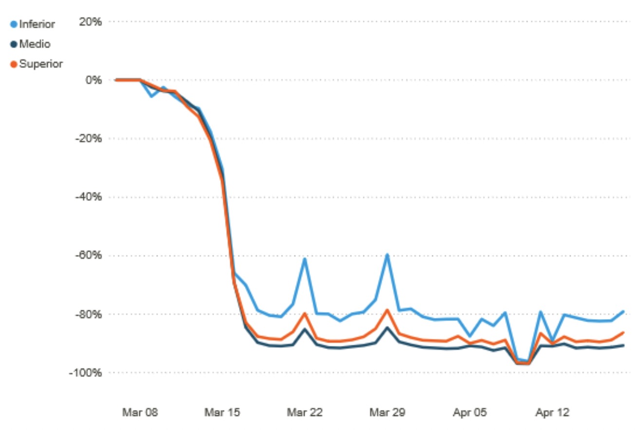 La historia de Daniel es representativa de millones de trabajadores informales de América Latina que no pueden hacer teletrabajo. En Lima, estos representan hasta el 50% al 65% de los trabajadores, y dependen en gran medida del transporte público. A pesar de la reciente y abrupta caída en la dependencia del sistema de autobuses Metropolitano de Lima (véase el gráfico abajo), los grupos socioeconómicos más bajos fueron quienes menos redujeron su demanda del sistema. Uso del sistema de buses Metropolitano de Lima por nivel socioeconómico