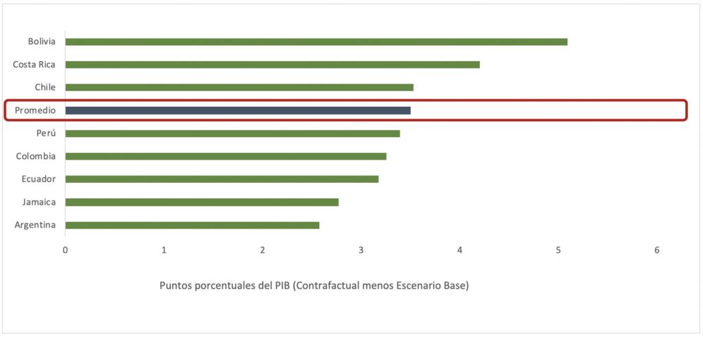 Fuente: De Estructuras a Servicios: El Camino a una Mejor Infraestructura en América Latina y el Caribe.Nota: El gráfico muestra el cambio acumulado, en puntos porcentuales del PIB, del escenario contrafactual (es decir, el escenario con mejoras de eficiencia) menos el escenario base (es decir, sin cambios en los parámetros) a lo largo de 10 años.