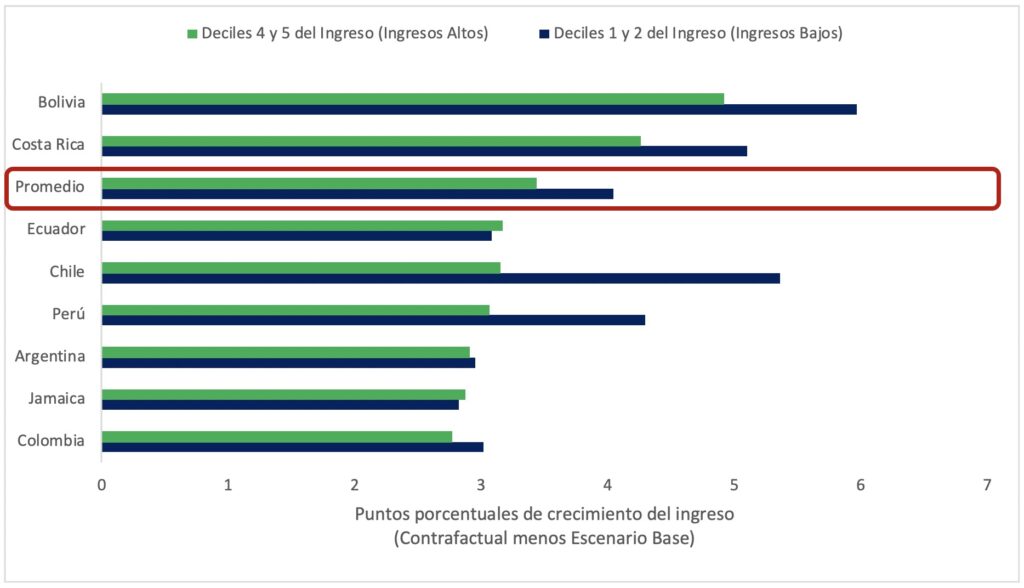 Fuente: De Estructuras a Servicios: El Camino a una Mejor Infraestructura en América Latina y el Caribe.Nota: El gráfico muestra el cambio acumulado, en puntos porcentuales del ingreso real, del escenario contrafactual (es decir, el escenario con mejoras de eficiencia) menos el escenario base (es decir, sin cambios en los parámetros) a lo largo de 10 años.