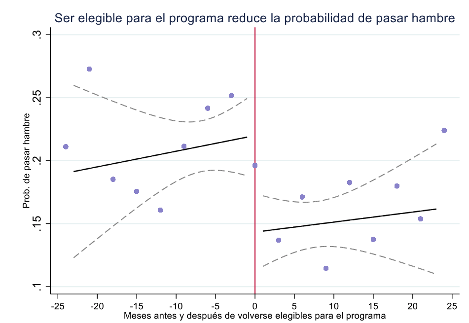 Notas: El gráfico muestra la probabilidad de que al menos un miembro de un hogar encuestado haya pasado hambre por falta de alimentos durante el inicio de la pandemia (abril de 2020) para los hogares en el margen de elegibilidad de Renta Dignidad. El eje horizontal está normalizado de forma que toma el valor 0 si la persona de mayor edad del hogar cumplió 60 años en marzo de 2020. Los valores negativos indican el número de meses que faltan para que el miembro de mayor edad del hogar cumpla los 60 años y, por lo tanto, pueda acogerse al programa, y los valores positivos indican el número de meses que han transcurrido desde que el hogar pudo acogerse al programa. Las líneas continuas denotan ajustes lineales y las líneas discontinuas denotan intervalos de confianza del 90%. Los hogares más afectados por la pandemia son los que más se benefician del programa