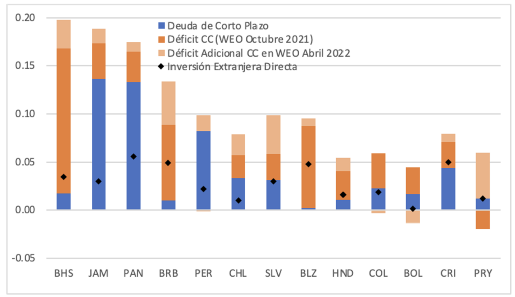 Fuente: Cálculos de los autores basados en Bloomberg y en el WEO del abril de 2022 del FMI.Nota: Deuda de corto plazo es la deuda externa pública y privada con madurez residual menor o igual a 12 meses. Exhibimos países cuyas necesidades financieras netas de los flujos de entrada esperados de la inversión extranjera directa están por encima de la mediana de la región.