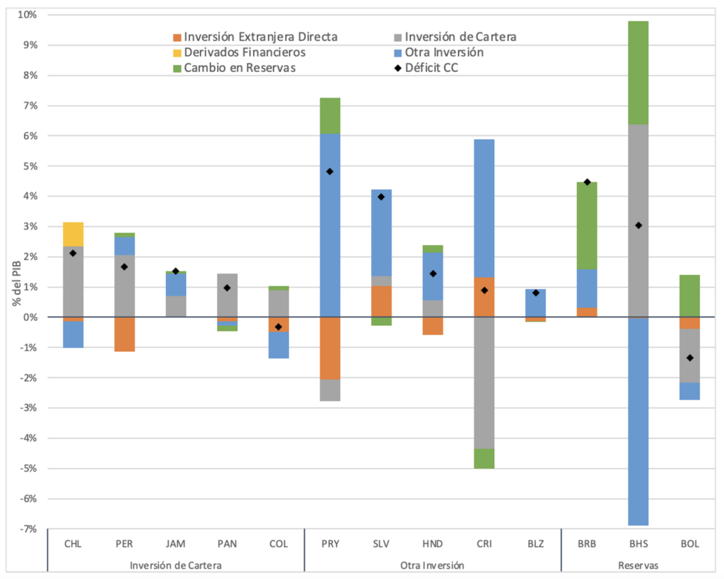 El gráfico 2 agrupa a los países según su principal fuente de financiamiento adicional previsto para cubrir su mayor déficit de CC. El primer grupo está conformado por cinco economías: Chile, Perú, Jamaica, Panamá y Colombia. Las cuales dependerán ante todo de los flujos de inversión de cartera externos, que consisten principalmente en emisiones de bonos en los mercados financieros internacionales. El hecho de que estas economías puedan y estén dispuestas a recurrir a la inversión de cartera indica que pueden acceder a los mercados internacionales de capitales a tasas razonables gracias a su inserción financiera en dichos mercados, sus perspectivas macroeconómicas y su estabilidad fiscal.
