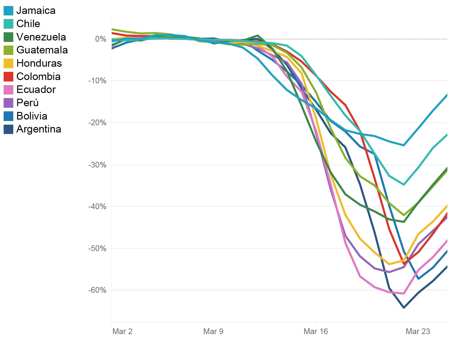 Los gobiernos de América Latina y el Caribe han impuesto en las últimas semanas una batería de medidas para promover el distanciamiento social y reducir la tasa de contagio del coronavirus. Si bien está claro que la movilidad de las personas se ha reducido fuertemente, subsisten importantes preguntas sobre el fenómeno. ¿Cuánto se ha reducido la movilidad en la región? ¿En qué países la movilidad ha caído más fuerte y por qué? ¿Cuándo comenzó a bajar la movilidad y cómo evolucionó esta variable en el tiempo? Los gobiernos necesitan respuestas con información clara, objetiva y precisa. La información es vital para que los gobiernos puedan entender el contexto en el cual están operando, y les podría dar luces para entender el impacto de las medidas implementadas, en qué zonas han tenido un mayor acatamiento y cómo los impactos han evolucionado en el tiempo. Con el lanzamiento del Mapa de Movilidad de las Personas, esperamos contribuir a resolver estos interrogantes y apoyar los esfuerzos de los gobiernos en pos de doblegar la pandemia del coronavirus. En particular, el Mapa presenta estadísticas de movilidad con alta granularidad espacial y temporal. Específicamente, la herramienta presenta la caída porcentual en el número de personas que recorren más de 1 kilómetro cada día respecto a una semana de referencia (del 5 al 11 de marzo).
