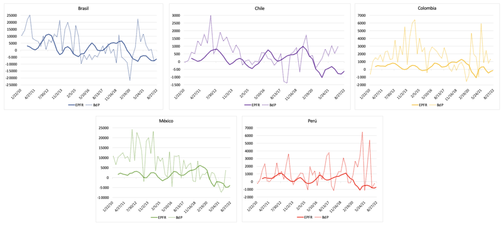 Si bien los datos del EPFR solo cubren un pequeño subconjunto de los financiadores externos de un país, son un indicador adelantado del flujo financiero agregado. El gráfico 2 muestra un panel con las cinco economías de América Latina descritas anteriormente. En cada panel de países, los flujos de entrada de inversiones de cartera en las estadísticas de la balanza de pagos (línea punteada) parecen moverse alrededor de los flujos trimestrales del EPFR (línea continua). En todos los casos, los datos más oportunos del EPFR apuntan a una reducción constante de los flujos de capital externo en el segundo y tercer trimestres de 2022, haciendo más duras las condiciones financieras para la región.