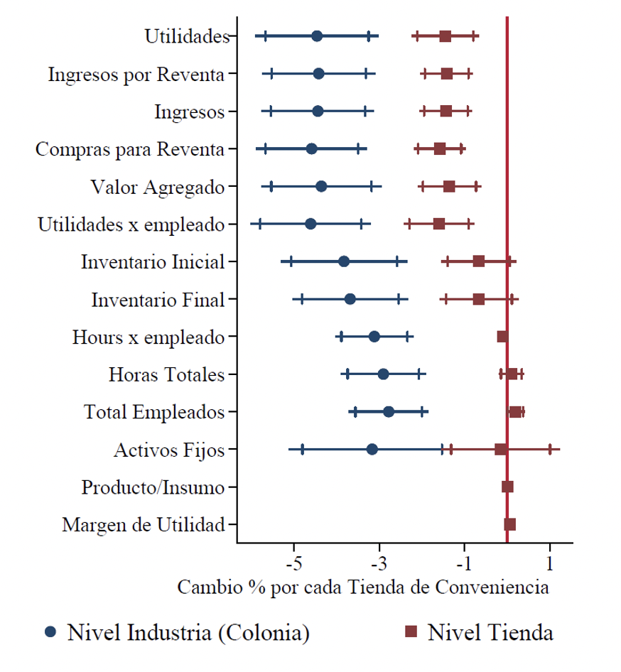 Nota: El gráfico muestra el efecto promedio de una tienda de conveniencia adicional en la colonia en las tienditas. Los intervalos de confianza son del 90 y 95%. Descrubrí que la introducción de las cadenas de minimercados ha tenido un indudable efecto competitivo. Un minimercado adicional en un barrio reduce el número de tienditas en cuatro. Esto significa que la ampliación de cero al número promedio de cadenas en un barrio reduce el número de tienditas en un 15%. Esta reducción no se debe a que cierren más tienditas sino a un descenso del 21% en la apertura de nuevas. Los efectos adversos sobre las tienditas se concentran en el margen extensivo. A nivel de barrio, las utilidades totales, los ingresos, el valor añadido, las existencias, los empleados y las horas trabajadas disminuyen entre un 20% y un 30%. Sin embargo, la magnitud de estos efectos adversos a nivel de tienda (margen intensivo) es menor, oscilando entre el 0% y el 7%.