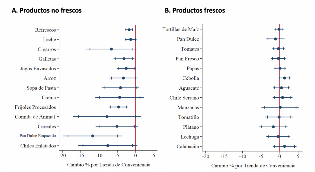 Los clientes siguen comprando en las tienditas, pero con menos frecuencia. Una expansión de las cadenas de minimercados desde cero hasta el número promedio en un barrio disminuye la probabilidad de que los vecinos compren en las tienditas en un 4%. Los que siguen comprando en tienditas lo hacen un 7% menos a menudo y compran un 10% menos. Las cadenas no afectan el gasto de los hogares en tienditas de productos frescos como tortillas, pan fresco, frutas y verduras, que a menudo los propietarios de las tiendas adquieren a diario en los mercados centrales o preparan ellos mismos. Pero sí disminuyen en un 15% las compras de los hogares en las tiendas tradicionales de productos envasados y estandarizados, como refrescos, leche y jugos embotellados.