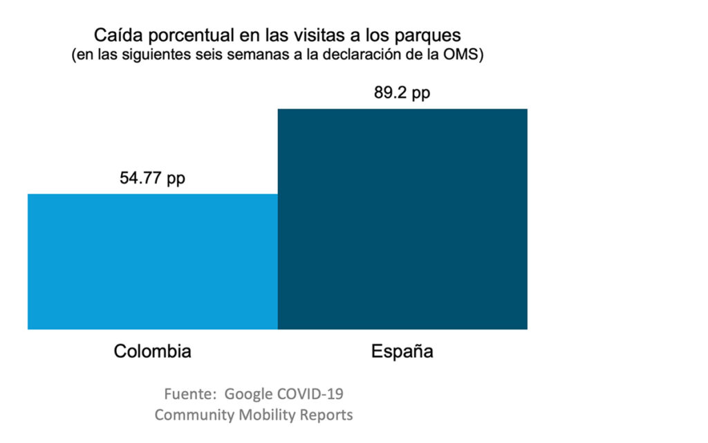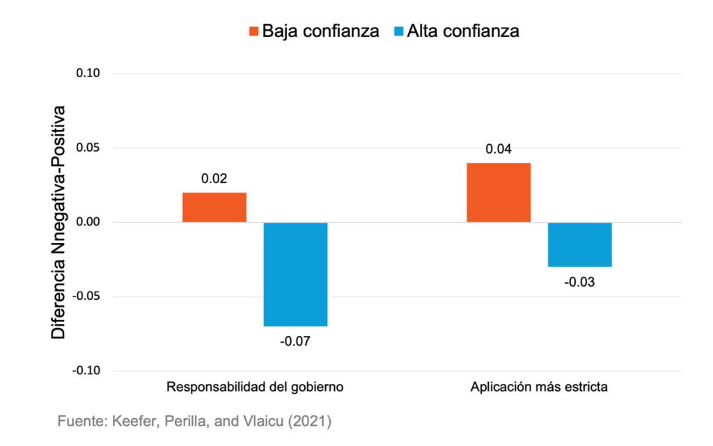La encuesta incluyó experimentos aleatorios para examinar los efectos de diferentes escenarios relacionados con la pandemia de la COVID-19 en las actitudes hacia las políticas por parte de los funcionarios públicos. En uno de los experimentos, la encuesta midió las actitudes hacia las políticas públicas de distanciamiento social. Uno de los tratamientos, la contextualización positiva, mostraba a los encuestados un gráfico de barras con el nivel de distanciamiento social del país al comienzo de la pandemia, junto a la media mundial, que en el momento del experimento era menor que en los países de América Latina. Así, el tratamiento positivo presentaba un escenario de distanciamiento social relativamente alto. El otro tratamiento, la contextualización negativa, mostraba un gráfico de barras similar que informaba el nivel de distanciamiento social de cada país junto con la estadística nacional de España, que en su momento tuvo una mayor observancia del distanciamiento social que los países de América Latina. Así, el tratamiento negativo presentaba un escenario de distanciamiento social relativamente bajo. Véase el gráfico 1.