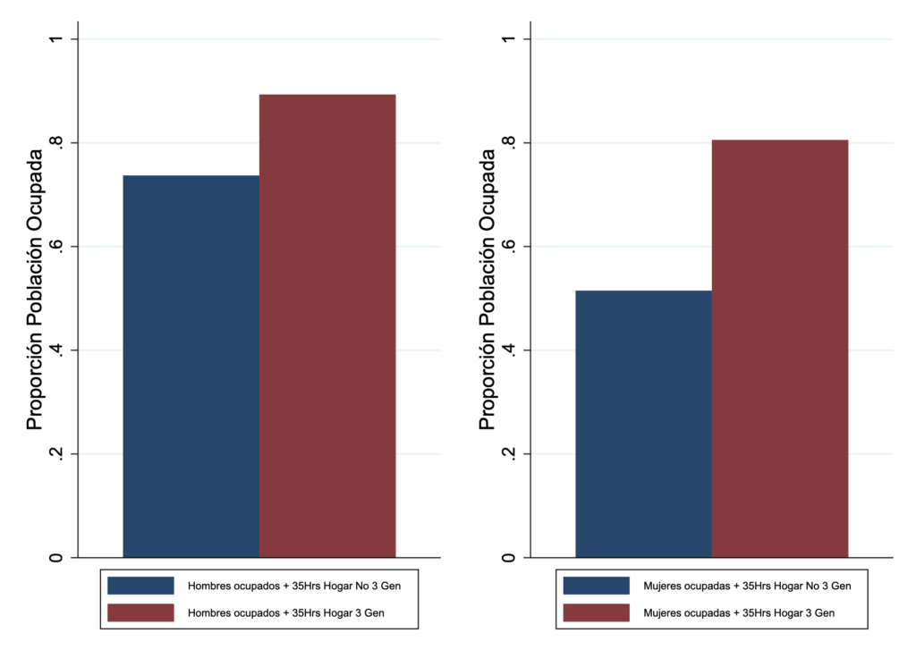 Los miembros de los hogares de tres generaciones no solo difieren de los demás hogares en la probabilidad de estar empleados, sino también en el número de horas trabajadas. Es más probable que los hombres y mujeres con empleo trabajen 35 o más horas a la semana (tiempo completo) si viven en hogares de este tipo, probablemente porque otros miembros del hogar, como las abuelas, alivian la preocupación por el cuidado de los hijos de ambos progenitores. Sin embargo, el aumento de la probabilidad de tener un empleo a tiempo completo es notablemente mayor en el caso de las mujeres. Las mujeres empleadas en hogares de tres generaciones tienen más de un 50% más probabilidades de estar empleadas a tiempo completo, un incremento más de tres veces superior al observado en los hombres.