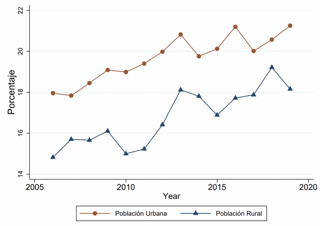 Tomemos el caso de México donde la proporción de hogares de tres generaciones ha aumentado constantemente en los últimos 15 años en casi un 20% en entornos urbanos y rurales (gráfico 1), de modo que hoy una quinta parte de la población del país vive en hogares de este tipo. Uno de los aspectos más interesantes de esta evolución es su influencia en los cambios sociales, sobre todo en el aumento del 5% (1,9 puntos porcentuales) de la tasa de participación femenina en la fuerza laboral entre 2005 y 2020.