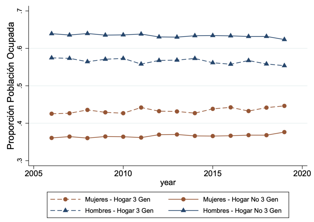 Entre muchas otras diferencias, los hogares de tres generaciones presentan menores diferencias entre hombres y mujeres en cuanto a participación en la fuerza laboral y las horas trabajadas. Esto, junto con el aumento de la proporción de hogares de tres generaciones, es un componente fundamental para comprender los importantes cambios que se han producido en el mercado laboral, las cuestiones de género, la distribución del tiempo y, quizás incluso, los valores de la sociedad.