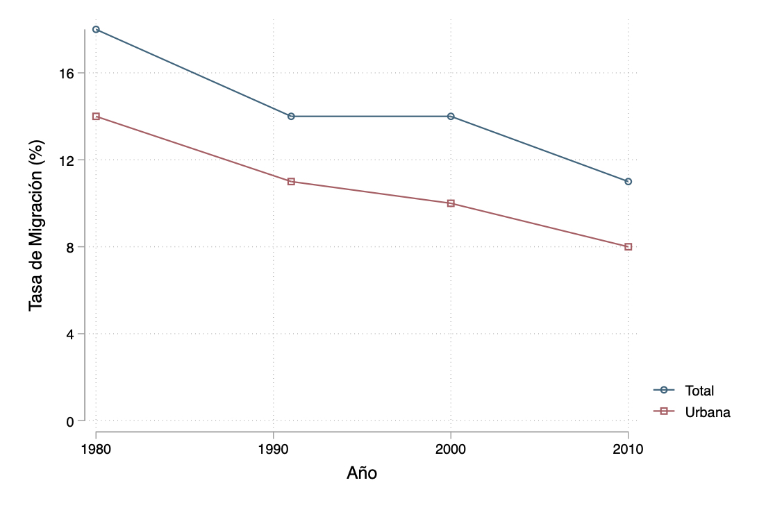 Nota: Estimaciones a nivel nacional construidas a partir de microdatos censales individuales. Definimos a los migrantes como personas en edad de trabajar que vivían en un municipio diferente cinco años antes del censo. Los migrantes urbanos son los que residían en ciudades en el momento del censo.