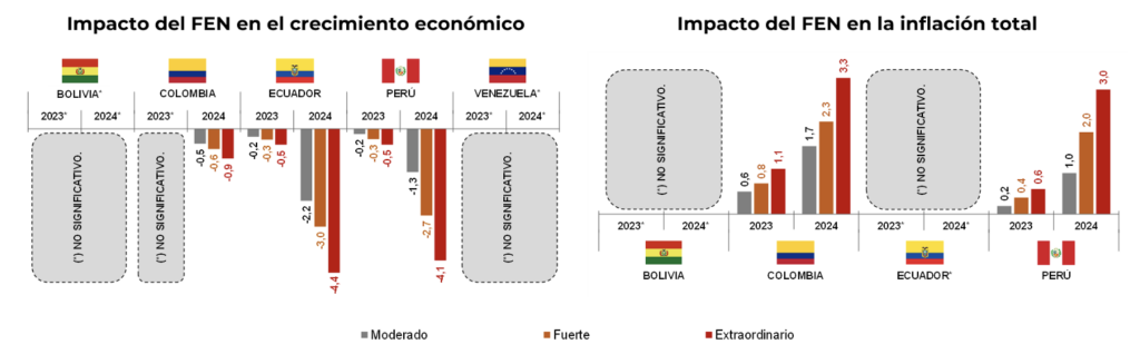 Las desviaciones se calculan en puntos porcentuales con respecto a un escenario sin la presencia del fenómeno El Niño. Los principales resultados revelan que el FEN en la región Andina podría haber reducido el crecimiento económico entre 0,2 y 0,5 puntos porcentuales en los meses de impacto de 2023, y entre 1,3 y 4,4 en los meses de 2024, siendo Perú y Ecuador los más susceptibles a dichos impactos. También se constató un posible aumento de la inflación en Colombia y Perú de entre 0,6 y 1,1 puntos porcentuales en 2023, y de entre 1,0 y 3,3 en 2024.