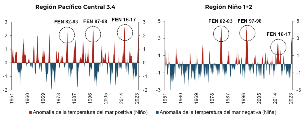 Fuente: National Oceanic and Atmospheric Administration (NOAA).Nota: Mide las desviaciones respecto al promedio de la temperatura de la superficie del mar en la región del Pacífico ecuatorial central y oriental. En el estudio se utiliza el ONI medido en una zona del pacífico en particular según el país de interés. Mientras que para Perú es la Región 1+2, para el resto de los países es la Región Central 3.4.