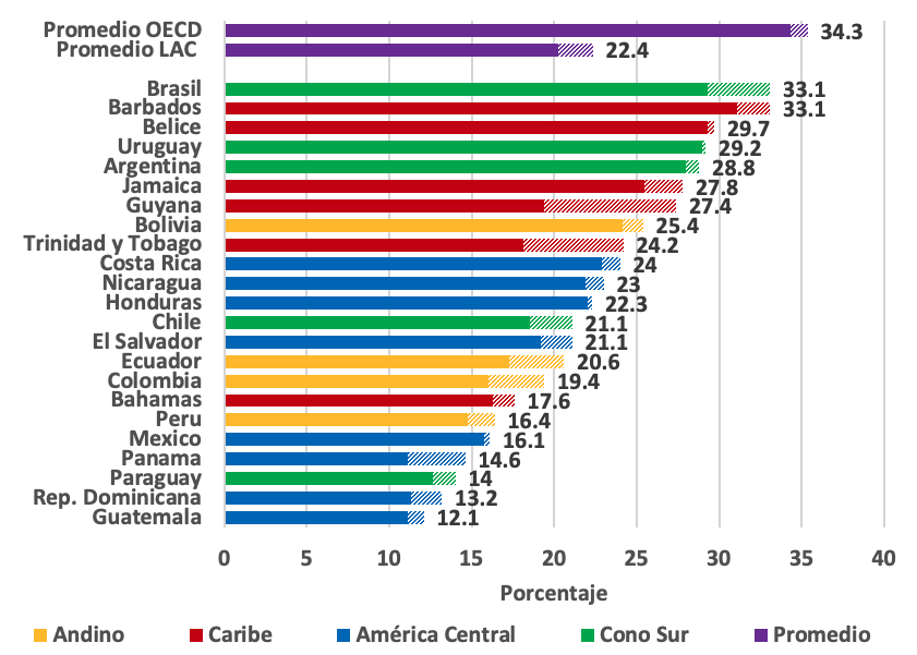 Dada la necesidad de consolidación fiscal, para aumentar la recaudación tributaria, las autoridades fiscales podrían incrementar las tasas o crear nuevos impuestos, o podrían expandir la base tributaria reduciendo el gasto tributario o mejorando el cumplimiento. Podría resultar tentador aumentar los impuestos (tasas o creación de nuevos impuestos), pero esto podría ser difícil de lograr, y en algunos casos, incluso resultaría contraproducente. Un problema de larga data en América Latina es su relativamente baja recaudación fiscal, con una media del 22,4% del PIB, que es inferior a la de los países desarrollados (34,3% en los países de la OCDE, véase el gráfico 1). Sin embargo, existe una importante heterogeneidad en la región, que va desde los países con alta presión fiscal como Brasil, Barbados, Belice, Uruguay y Argentina, donde ésta fluctúa entre el 29% y el 34% del PIB, hasta los países con baja presión fiscal como Guatemala, República Dominicana, Paraguay, Panamá, México y Perú, donde ésta fluctúa entre el 12% y el 16% del PIB. En el caso de los países con alta presión fiscal, habrá que aplicar políticas distintas a la de aumentar la tributación -que involucren mayormente medidas por el lado del gasto. Para los países con baja presión fiscal, habrá que aumentar las bases impositivas a medida que la recuperación cobre impulso y, en última instancia, el camino a seguir sería aumentar las tasas impositivas. Pero eso debe hacerse de manera que no se perjudique sustancialmente el crecimiento y la desigualdad.