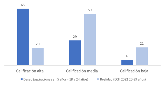 Diferencia entre la distribución de aspiraciones de jóvenes (18 a 24 años) y la distribución de trabajadores (23 a 29 años) por nivel de calificación (%)